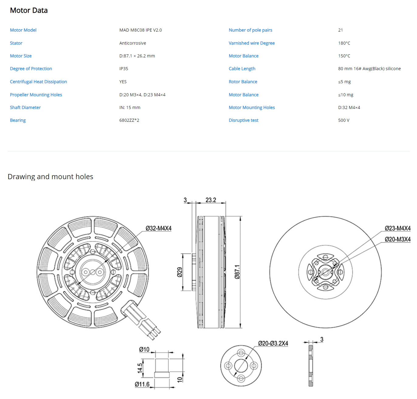 8108 motor is the most classic product among UAV motors. MAD M8 is one of the most efficient motors among them and the most widely used motors for UAV of high-end aerial photography, exploration, archaeology, remote sensing surveying, mapping etc. Endurance flight time varies from 30-120min.