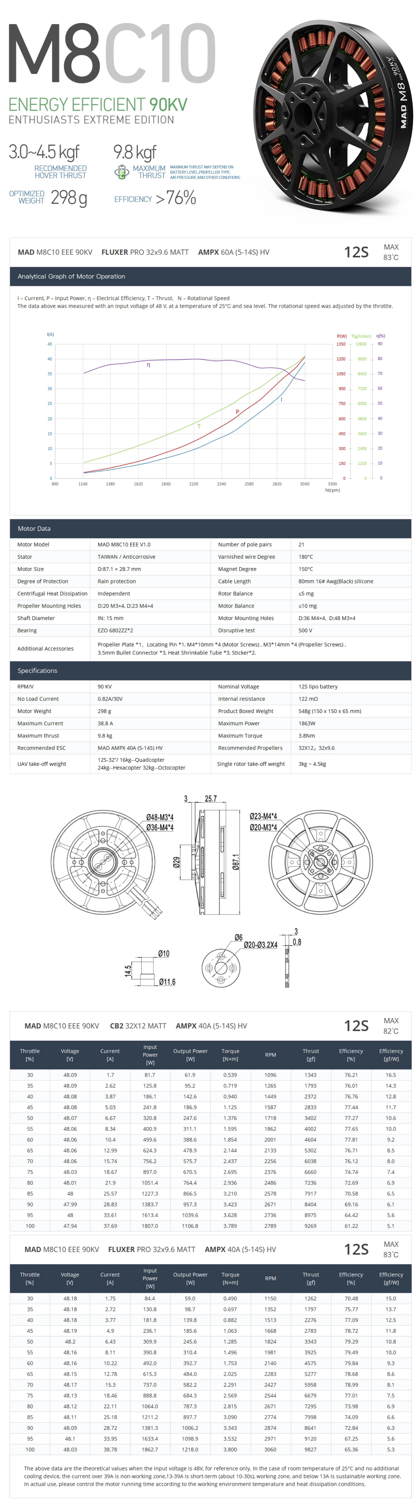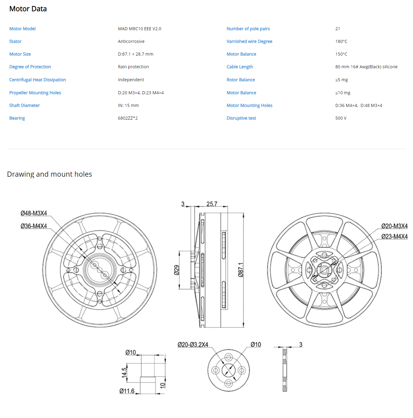 M8C10 motor is the most classic product among UAV motors. MAD COMPONENTS M8C10 is one of the most efficient motors among them, and the most widely used motors for UAV of high-end aerial photography, exploration, archaeology, remote sensing surveying, mapping etc. Endurance flight time varies from 30-120min.