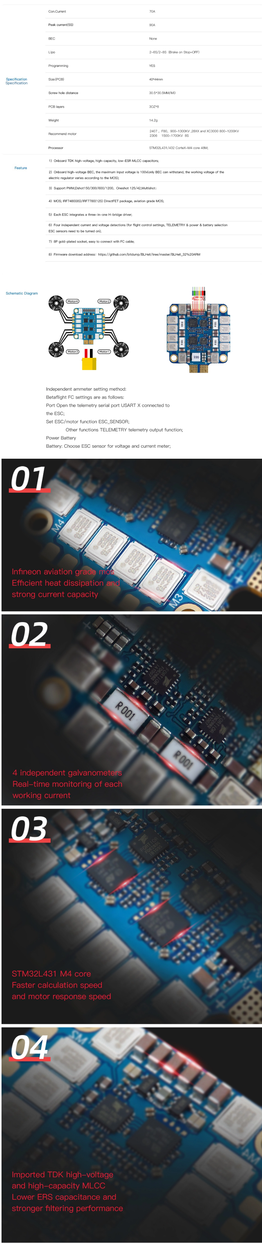 Model:BLHeli-32 70A • Input Voltage: Support 2-6S/(2-8S) Lipo •Inclulded 1pc 50V 1000uF 1pc 8P connector