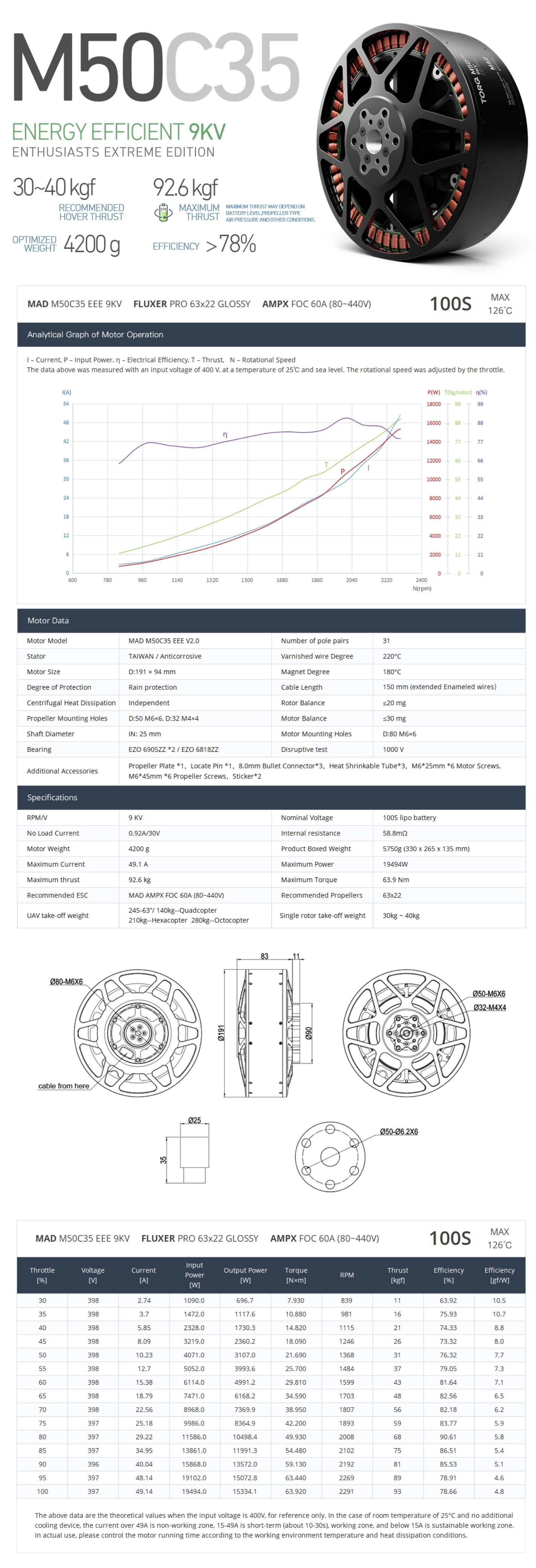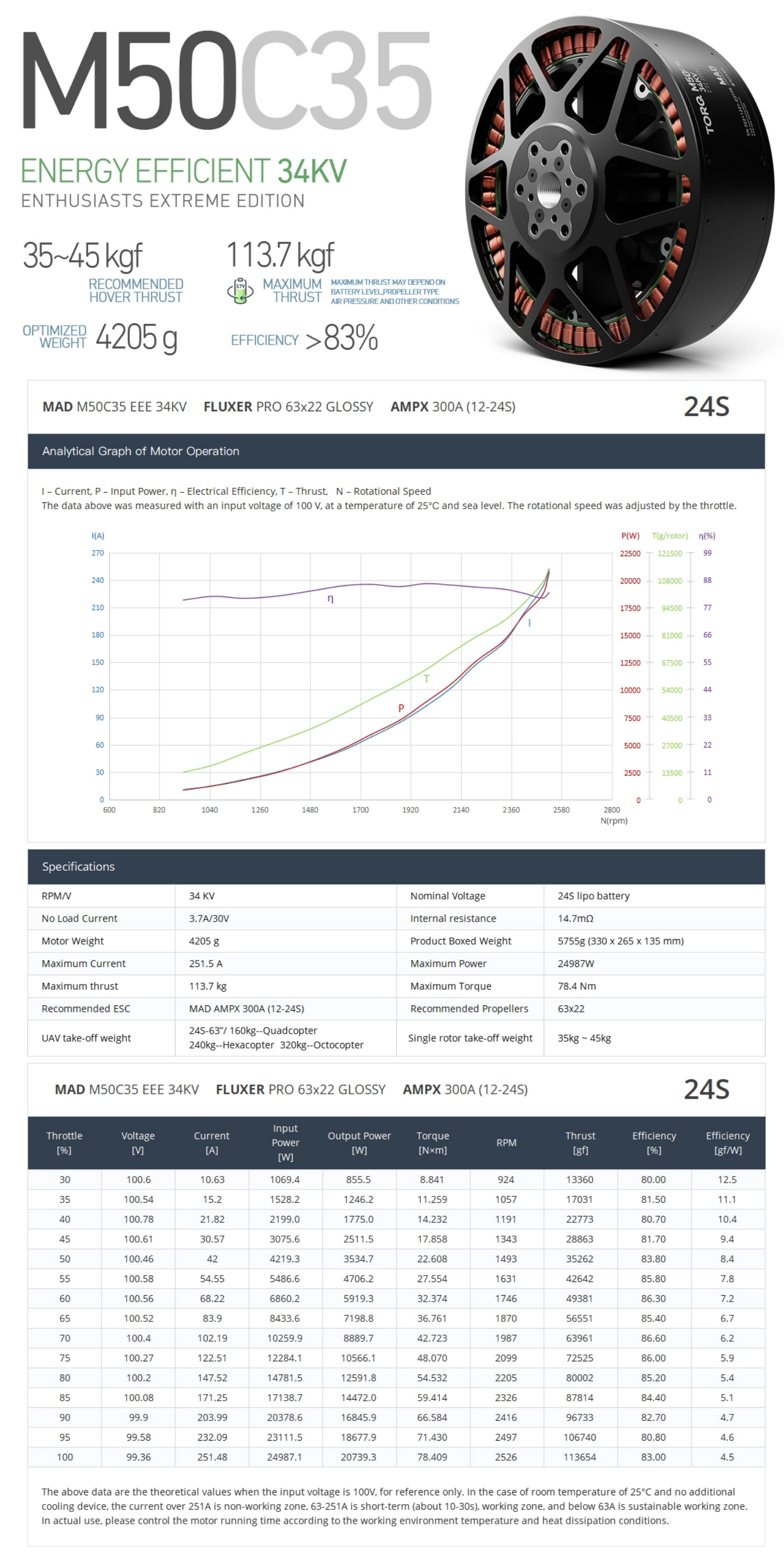 3.40KV Recommend ESC:AMPX 300A(12-24S) propeller:CB2 57X19 or AMPX 200A(12-24S), propeller: fluxer pro 60X20