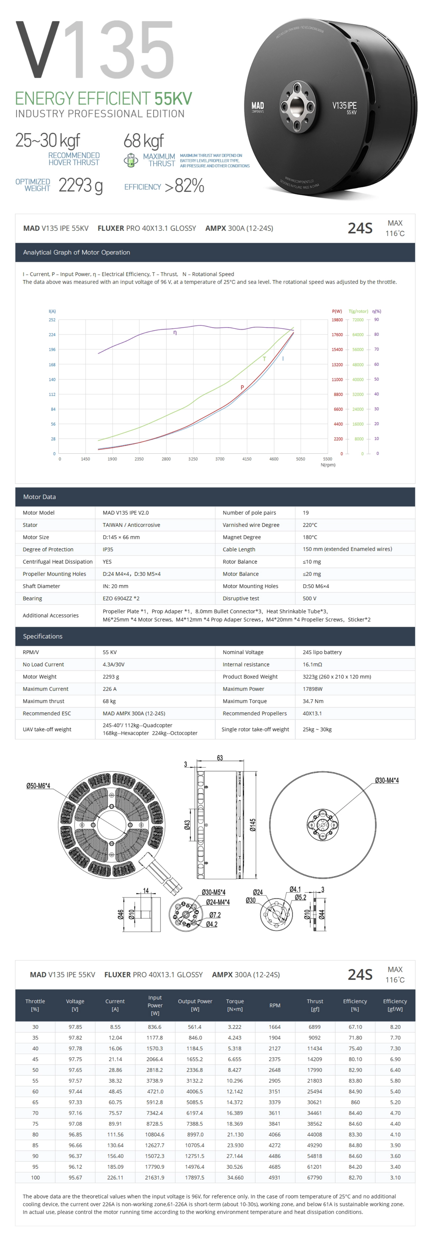 Designed to carry payloads of 25-30kg per rotor, with 40″ carbon propeller. Max thrust is up to 68kg per rotor, unit motor weighs only 2293g. With large pitch EVOTL CF propellers, achieving large load, high efficiency and excellent reliability, providing reliable power support for various endurance flights of professional UAVs.